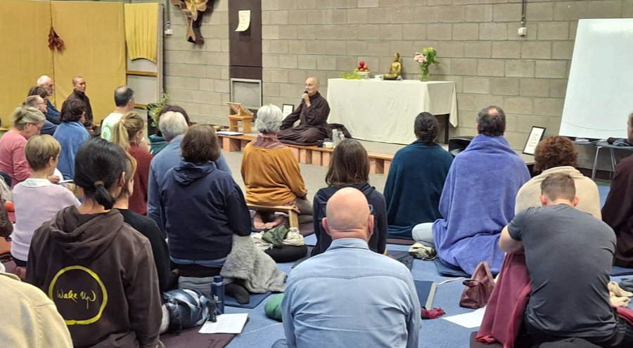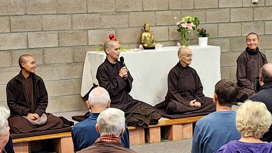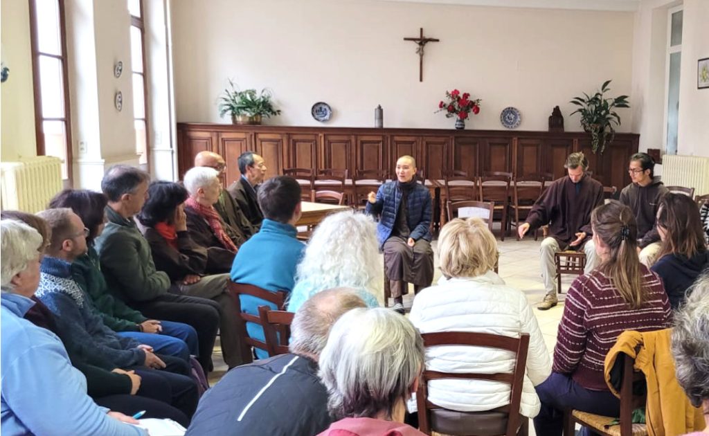 Nous étions près d’une centaine le week-end du 27-28 septembre lors de la retraite organisée à l’Abbaye des Bénédictines à Liège par les sanghas belges francophones du Village des Pruniers. Nous avons eu le grand bonheur de recevoir cinq moniales autour de notre chère Soeur Giac Nghiem (Soeur Elisabeth), de la Maison de l’Inspir.